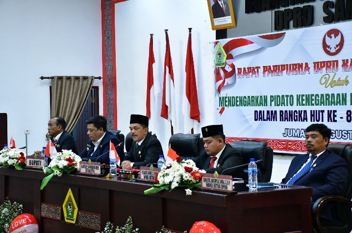 Bupati Samosir Vandiko T. Gultom bersama Wakil Bupati Ariston Tua Sidauruk dan jajaran DPRD Kabupaten Samosir mengikuti siaran langsung Pidato Kenegaraan Presiden RI Prabowo Subianto tahun 2025 melalui Rapat Paripurna DPRD yang dibuka resmi oleh Ketua DPRD Nasip Simbolon di Gedung DPRD Samosir, Jumat (15/8/25).