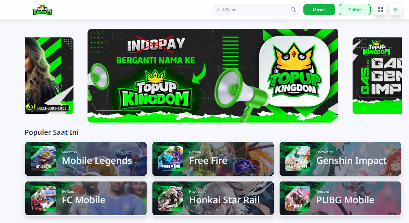 Pilih Game atau Produk di halaman utama sesuai dengan game favorit Anda, seperti Mobile Legends, Free Fire, Genshin Impact, PUBG Mobile, atau Honkai Star Rail.