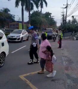 Bedahkasus.com, Medan-Wujud kepedulian terhadap keselamatan masyarakat, Kanit Provost Polsek Medan Tuntungan Aiptu Jhon Rusli Manalu terlihat turun langsung membantu warga dan anak-anak sekolah menyeberang jalan di Jl. Jamin Ginting, tepatnya di depan Gereja GBI Rumah Persembahan, Jumat (7/11) pagi.