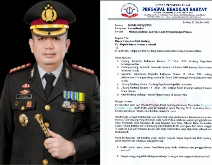 Surat Lembaga PKR dengan nomor 08/PKR- BKDS/X/2025 ditujukan langsung kepada Kapolresta Deli Serdang Kombes Pol Hendria Lesmana atas sejumlah poin – poin penting yakni, sejak dilakukan penggrebekan dan dua alat mesin meja ikan – ikan diamankan dari lokalisasi, hingga saat ini Polresta Deli Serdang masih belum merilis jumlah tersangka hingga pemilik lokalisasi yang di grebek tersebut.