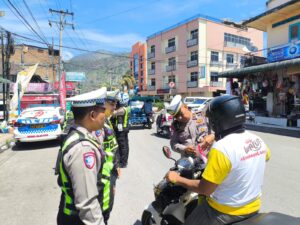Melalui kegiatan bertajuk “Gerakan Polantas Menyapa”, personel Satlantas menyambangi para pengendara di kawasan Bundaran Pasar Pangururan, Kabupaten Samosir. Kegiatan yang dipimpin oleh Kanit Regident Satlantas, IPDA Jusup Ketaren, ini berlangsung penuh kehangatan, dengan senyum, sapaan ramah, dan pesan-pesan keselamatan yang mengena di hati.