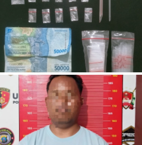 Dari tangan pelaku, petugas mengamankan barang bukti berupa uang tunai Rp100.000, 11 plastik klip transparan berisi butiran kristal diduga sabu, dua buah skop yang terbuat dari pipet, dan dua bungkus plastik klip transparan kosong.
